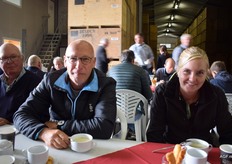 Als dank voor de rondleiding en lunch met knolselderijsoep bij Iltom een Boer Ted pakket voor Marc van Vooren (l) en zijn vrouw