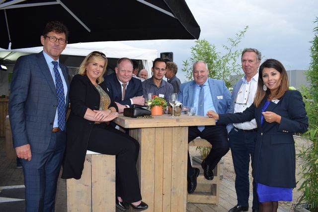 Een toost op de succesvolle samenwerking, vlnr Ron de Greeff, Ingrid Henderickx, Rob Huijbrechts, Dammis van der Staaij, Peter Huijbrechts en Lizbeth van den Boogaert