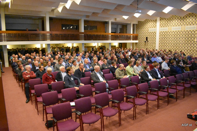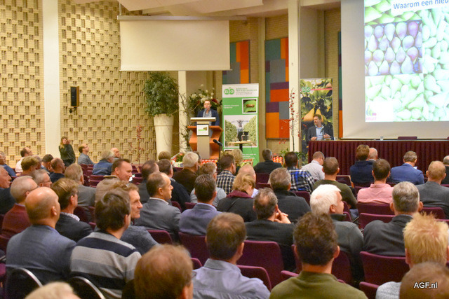 "Jan Peeters (Fruitconsult) houdt zijn presentatie over "Nachtvorstbestrijding door beregening"."