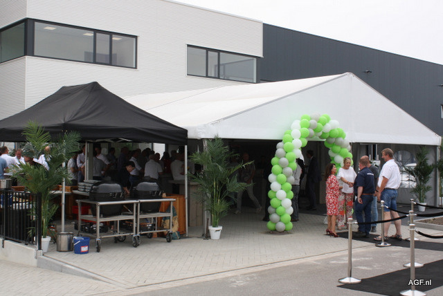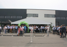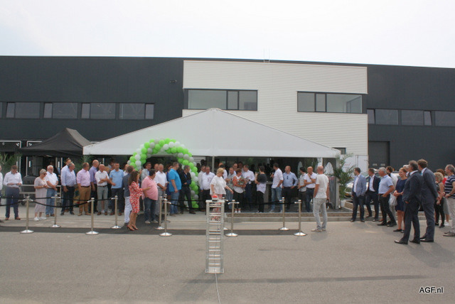 Op 4 juli werd de nieuwbouw van bedrijfshal 3821 op Fresh Park Venlo feestelijk geopend. Ingrid Hendrickx en Lizbeth van den Boogaart van Fresh Park Venlo heten de bezoekers welkom