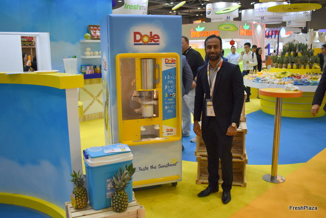 Hassan Jamil van Dole Asia Singapore presenteert de Piñabar: een machine die ananassen direct schilt en snijdt