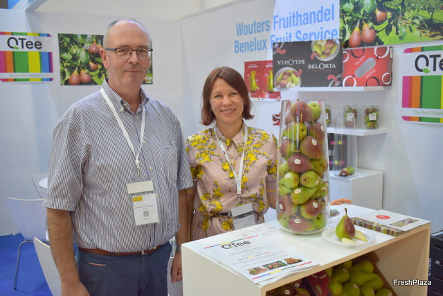 Kris Wouters en Irysha presenteren de QTee peer namens de Belgian Agricultural Marketing Board