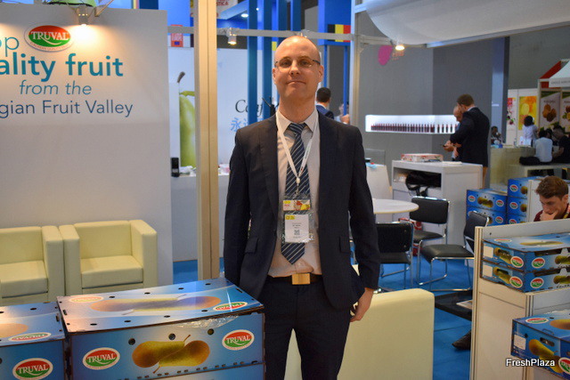 Thomas Simillion van de Belgian Fruit Valley. Volgens Thomas zijn de peren dit jaar nog zoeter dan voorheen, en daarmee zeer geschikt voor de Aziatische markt