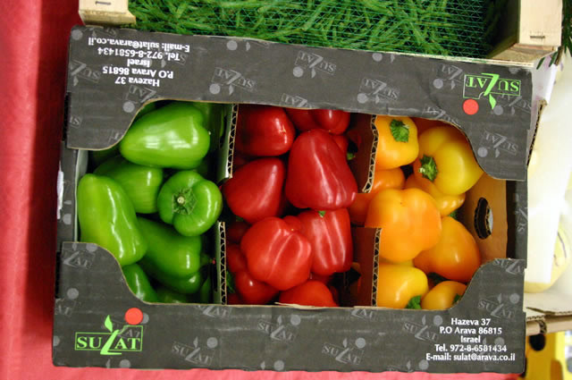 Drie kleuren minipaprika in een doosje