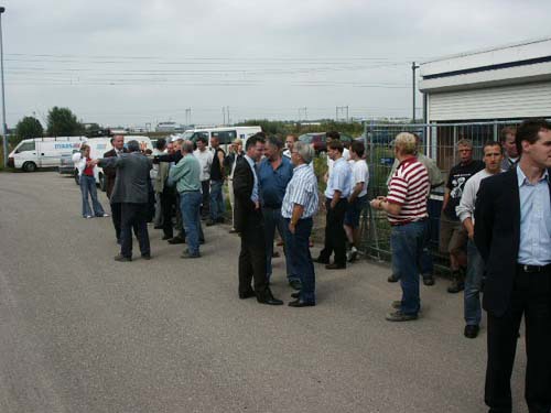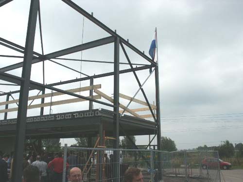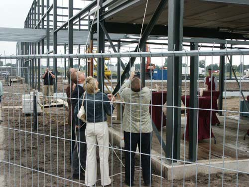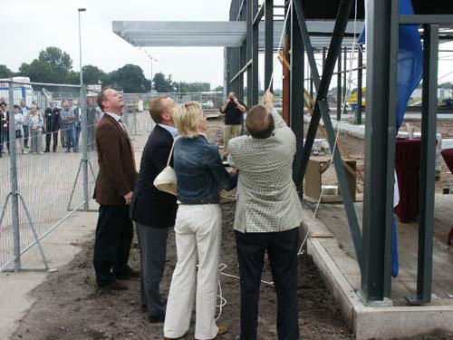 Bouwers, genodigden en medewerkers staan te wachten op wat komen gaat.