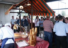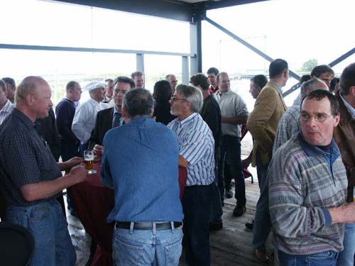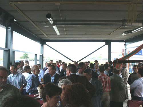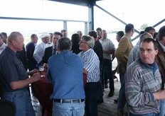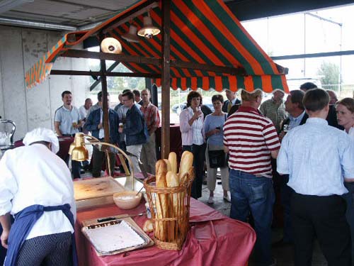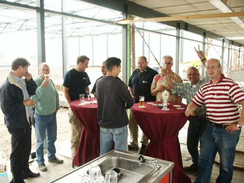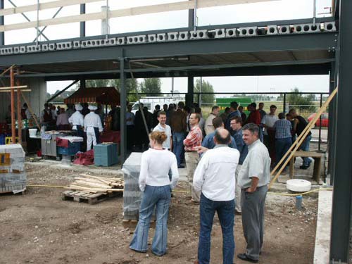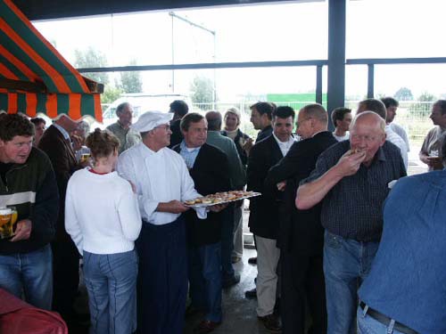 De aanwezigen genieten van een hapje en drankje, prima verzorgt door ´t Ruyterhofke, op de plaats van de nieuwe kantine.