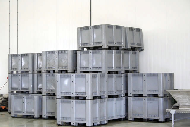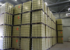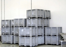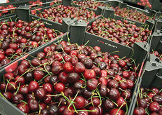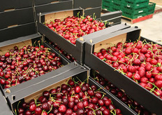 De kersen, welke grotendeels uit de eigen teelt afkomstig zijn, worden aangevoerd in deze bakken.