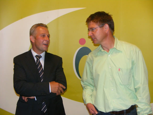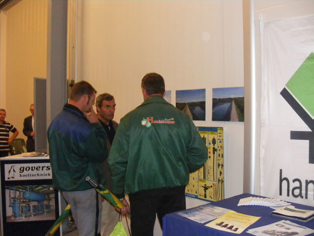 Piet Meeuwse van de gelijknamige handelsonderneming uit Goes in gesprek met Huib Houtekamer uit Krabbendijke.