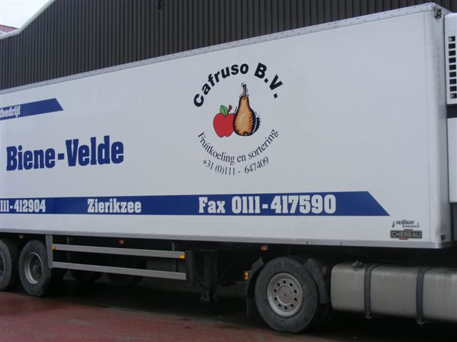 Het logo van Cafruso op een oplegger van de huisvervoerder.