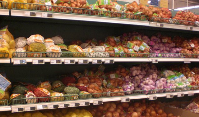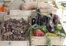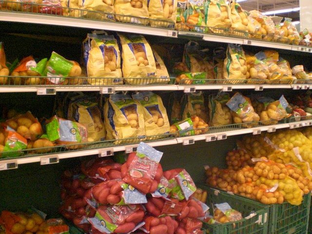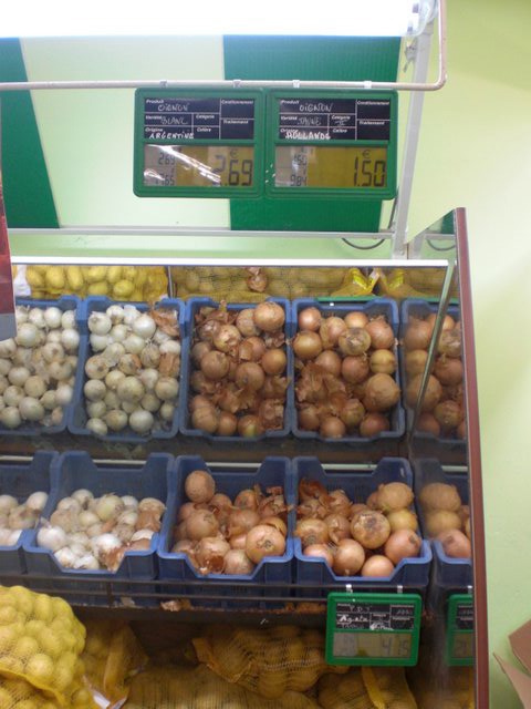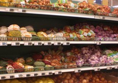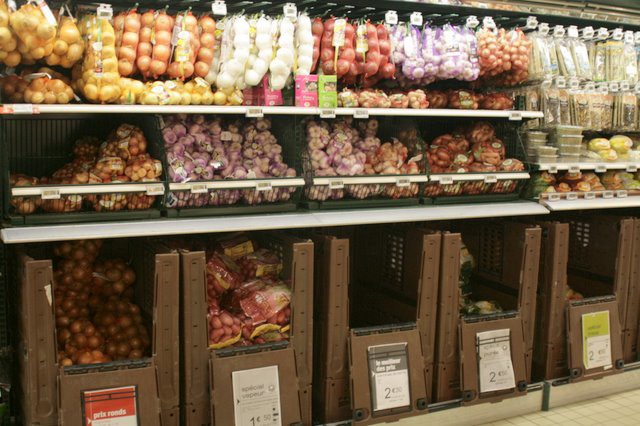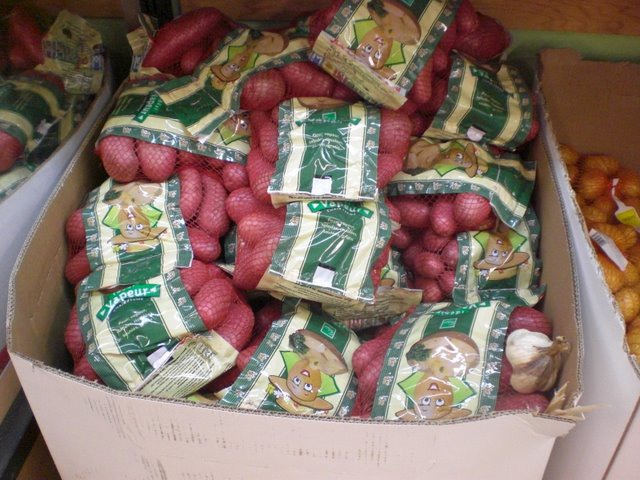 diverse soorten uien, sjalotten en knoflook. Daaronder de aardappelen in grote kratten