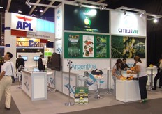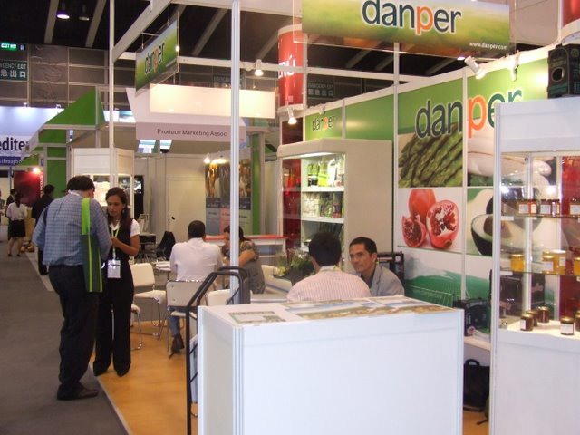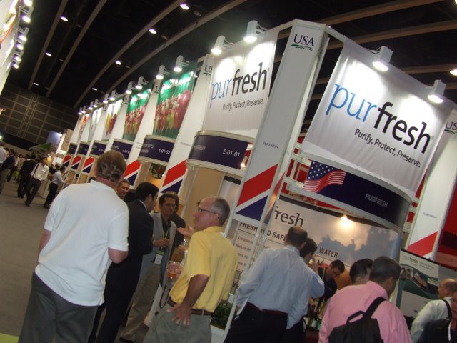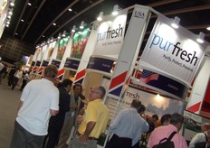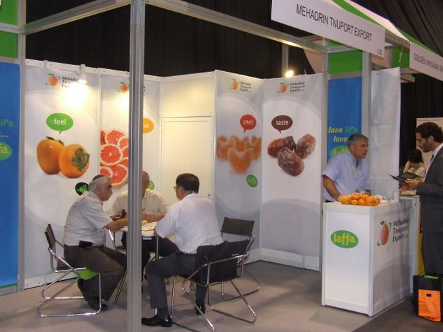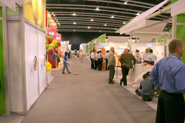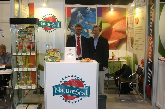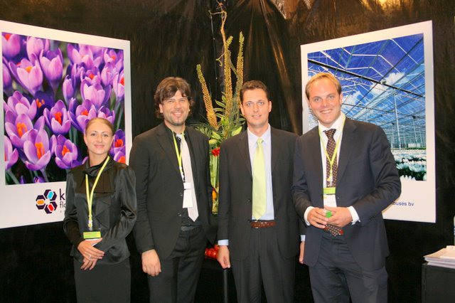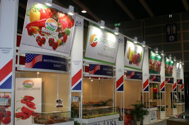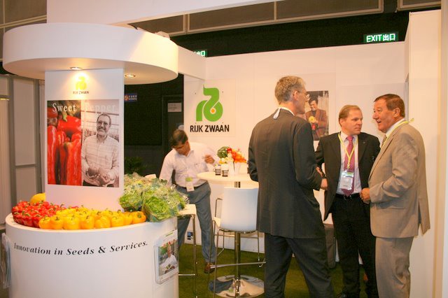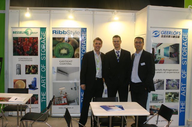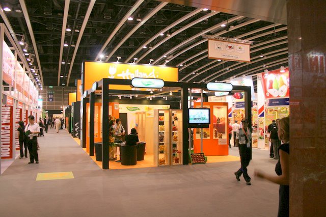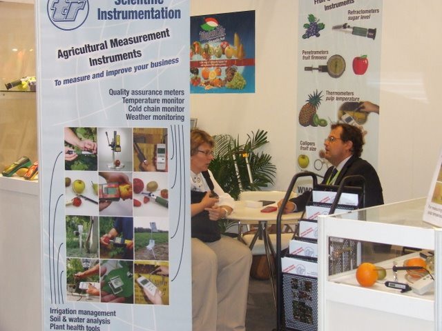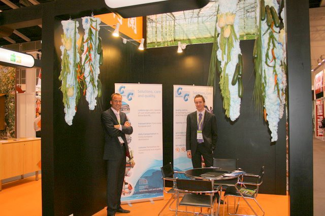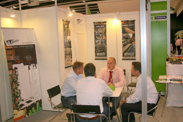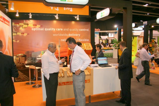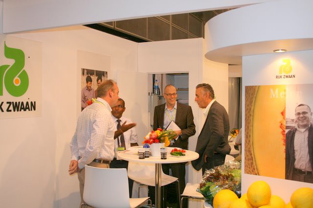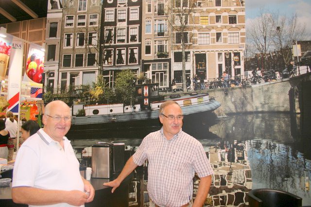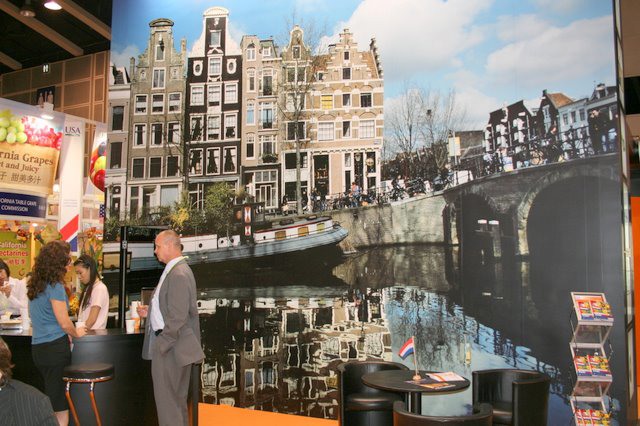De stand van de Holland Fresh Group. Een prachtige foto op de achterwand van een Amsterdamse gracht. Ger van Burik in gesprek met Esther van de Ende
