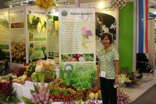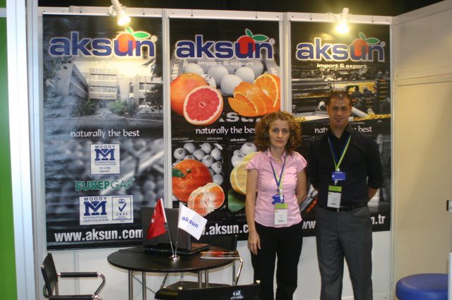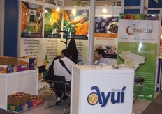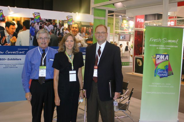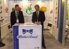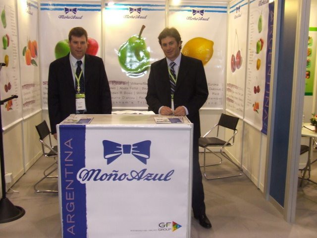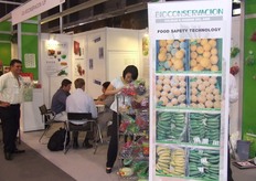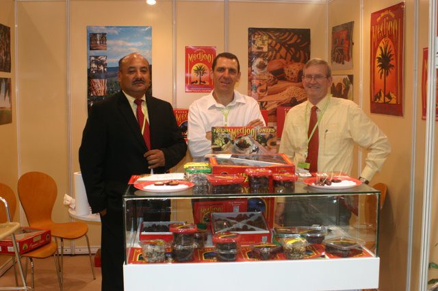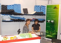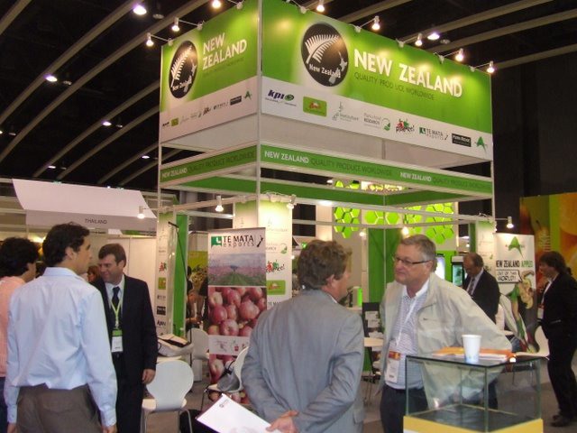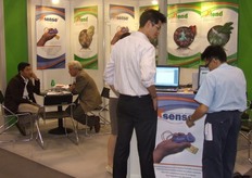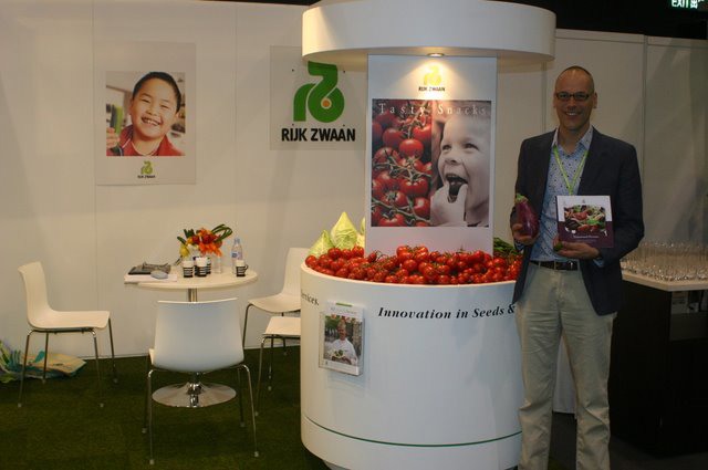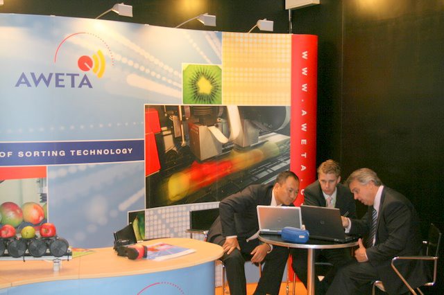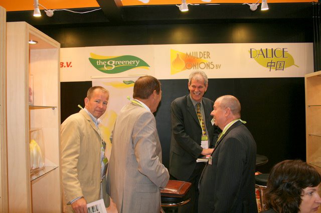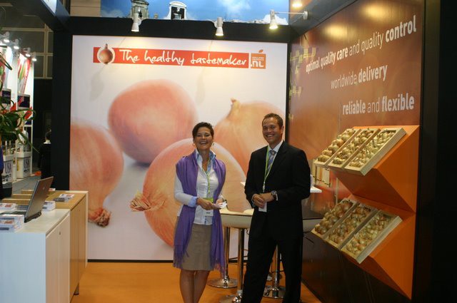 Jaap Wiskerke was vaak te vinden in de stand van Holland Product Promotions. Rechts Auke Heins met op zijn laptop de nieuwe uienwebsite en Madelon Daane