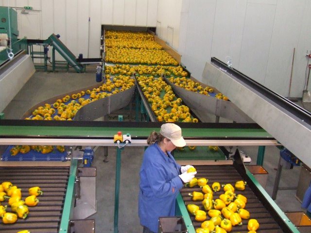 Op de gram nauwkeurig worden de paprika's gesorteerd. Dat wordt nog eens gecheckt op de band