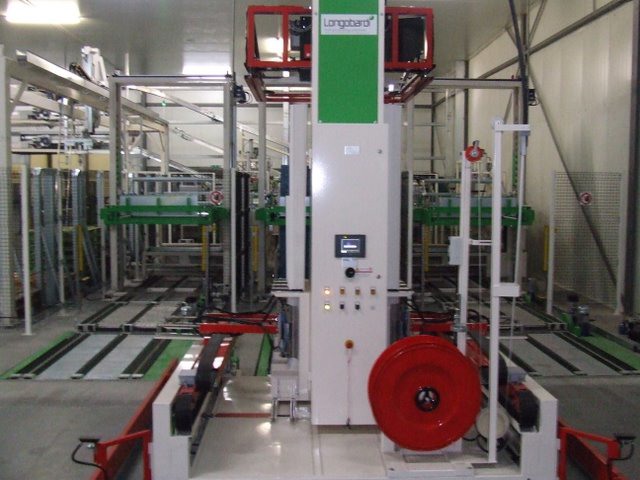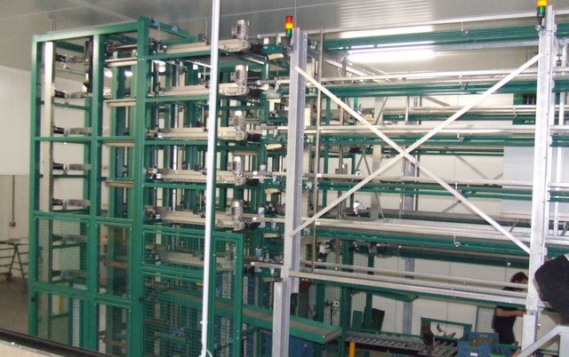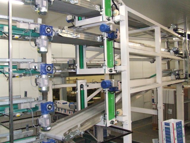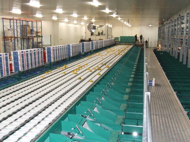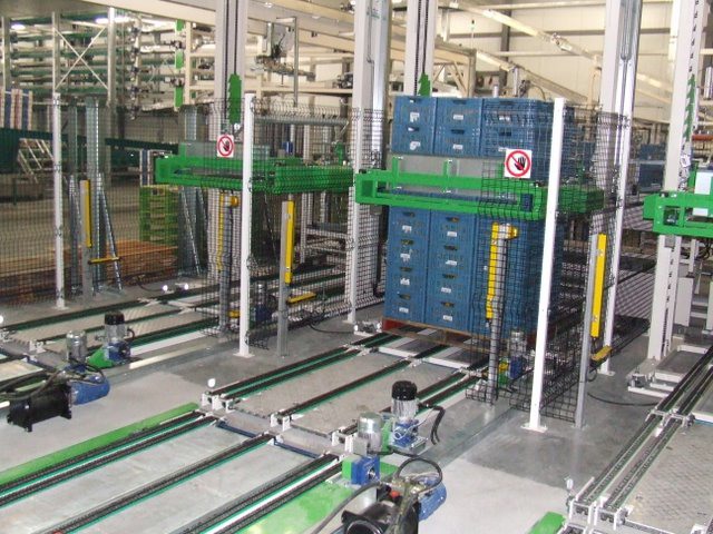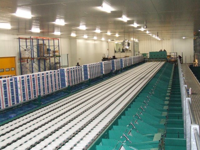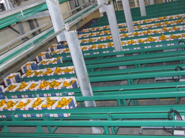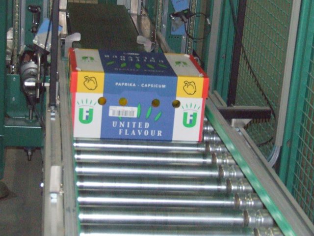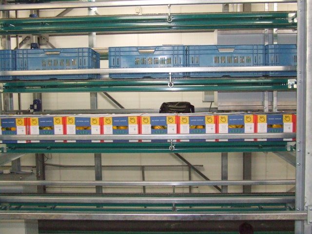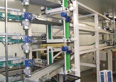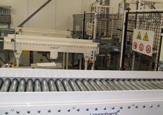 De dozen gaan in een lift richting pallatiseerder, die de paprika's dankzij de unieke code koppelt aan de juiste pallet