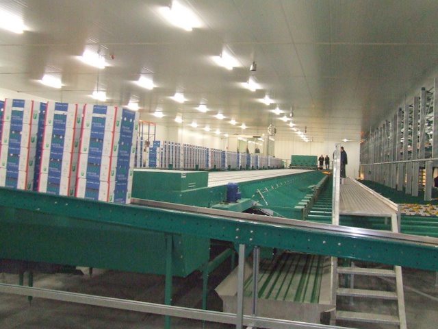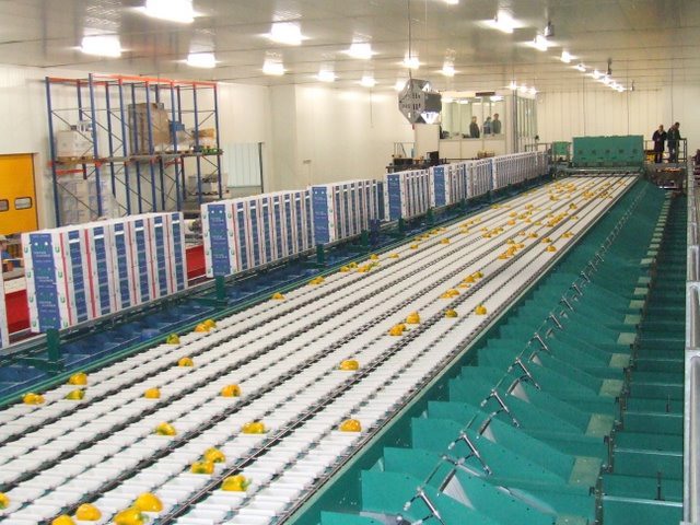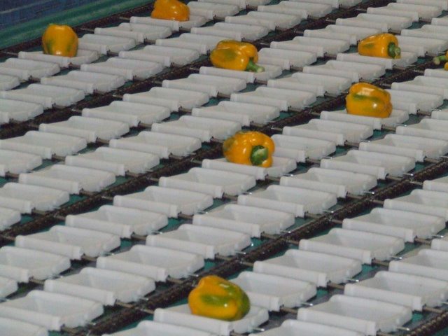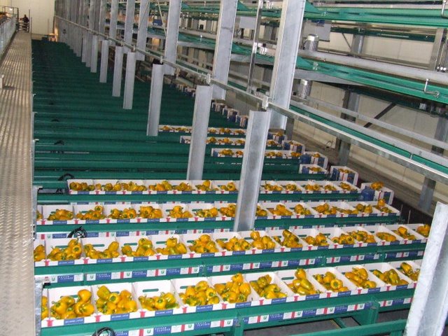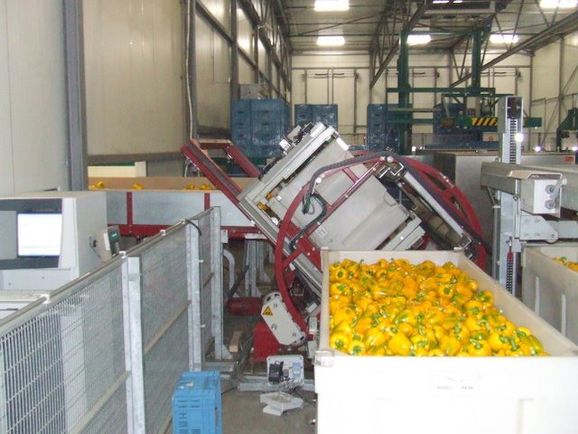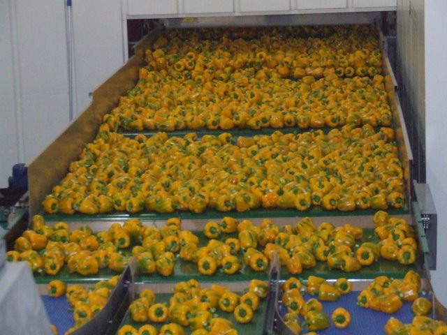 Hier werd de machine nog getest, bij volle capaciteit gaan er 18 ton paprika's over de machine