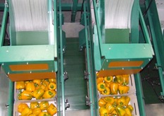 Alle kleuren worden aangevoerd. De machine herkent de kleuren ook. Zo kan er gesorteerd worden voor bonte of juist minder bont gekleurde paprika's voor de markten in VS en VK.