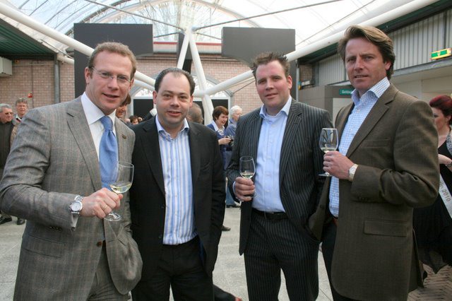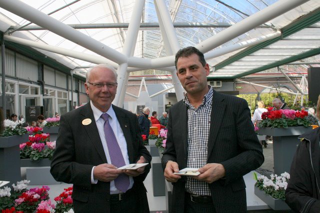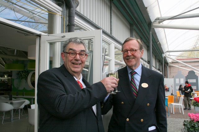Pieter Smits en de voorzitter van Raad van Bestuur van Keukenhof Holland brengen een toast uit
