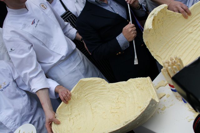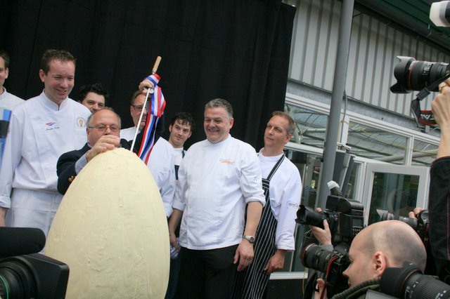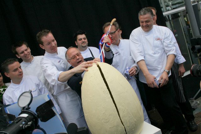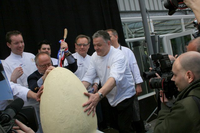 Onder toezicht van de chef-koks mag het enorme ei van witte chocola opgestoken worden met een reuzen-aspergesteekmes