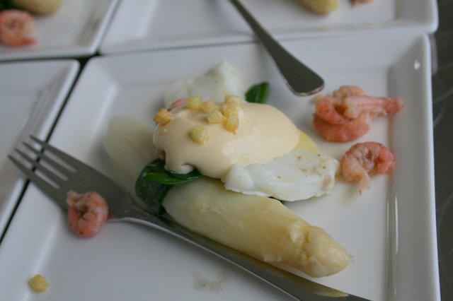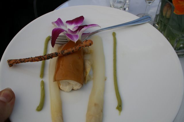 Asperge met eendelever,(links) wat nu niet bij iedereen in de smaak viel