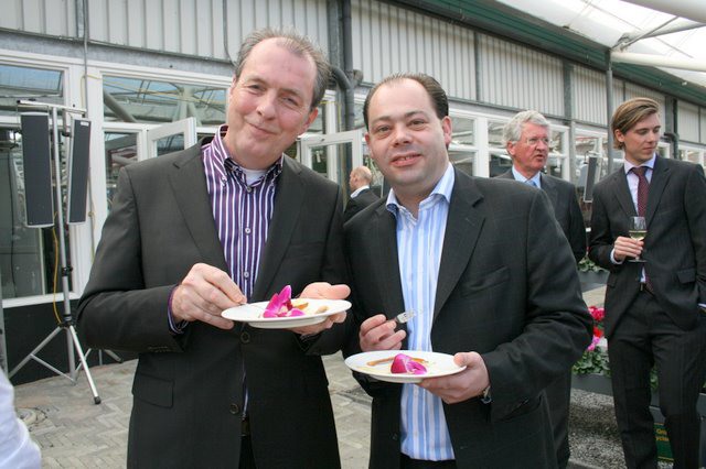 De vice-voorzitter Jan Pennings, met Gerard van Loon(rechts),productmanager (paarse!)asperges bij the Greenery