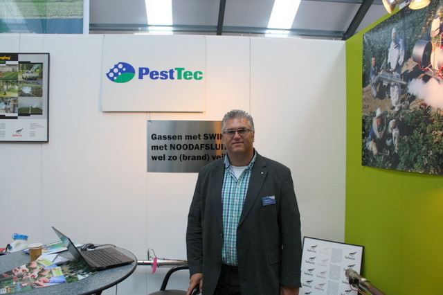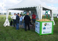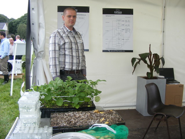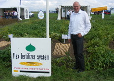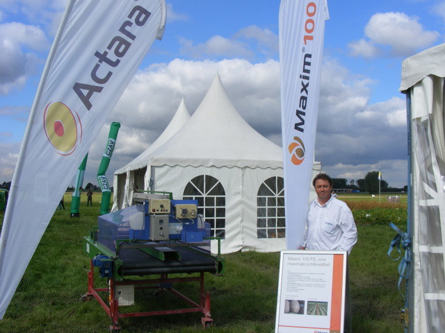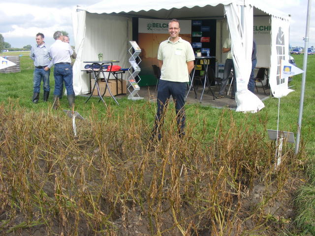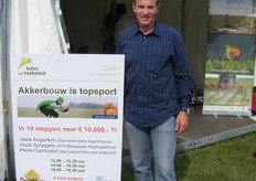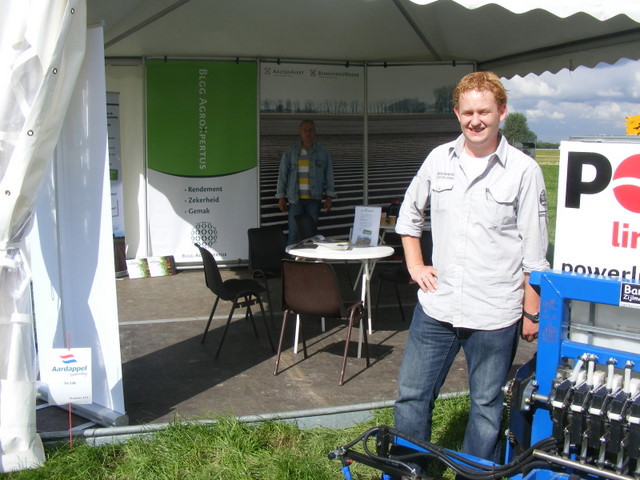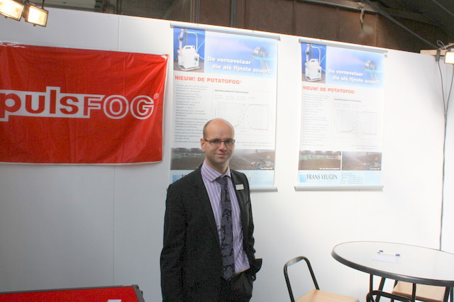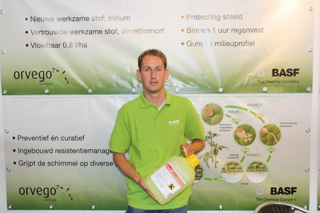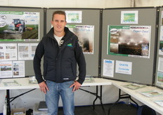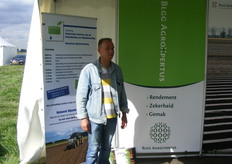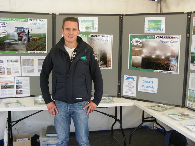 Roeland Kalkdijk van Syngenta bij de pieperdoes en de banieren van twee gewasbeschermingsmiddelen