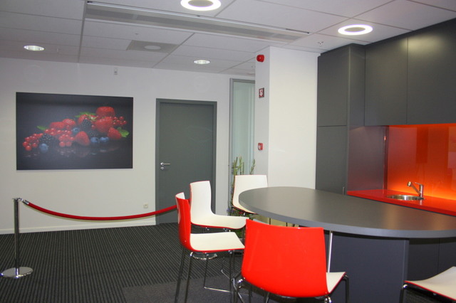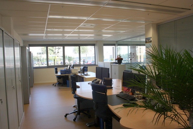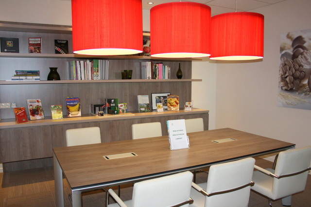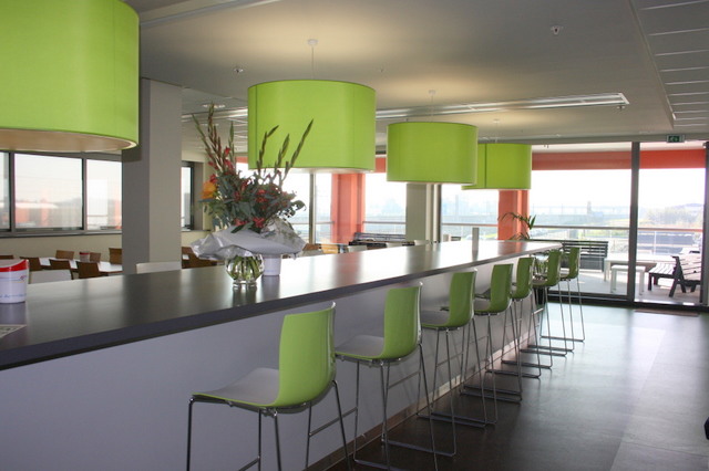 Kleurrijke stoelen en tafels fleuren de werkvloer op.