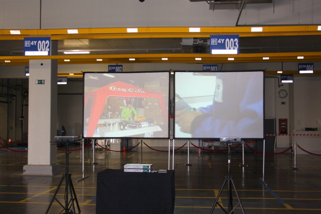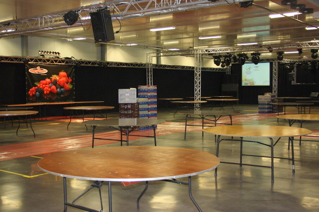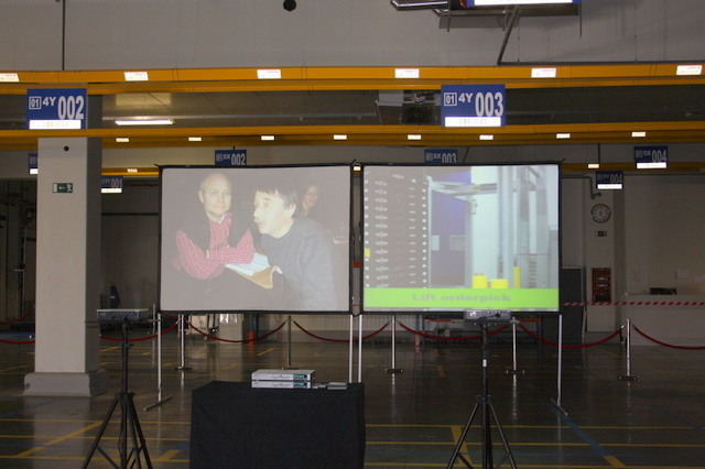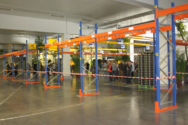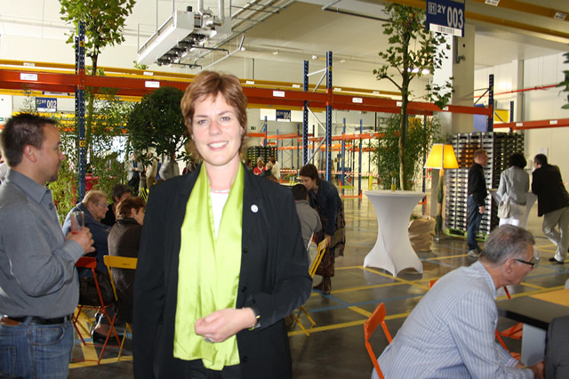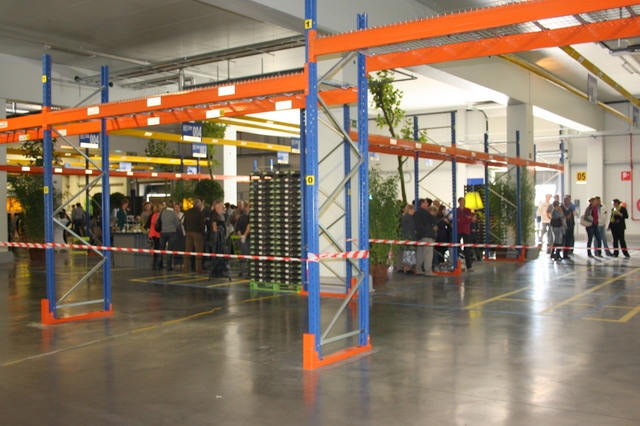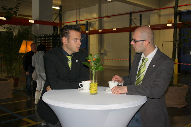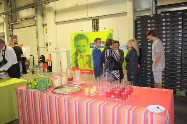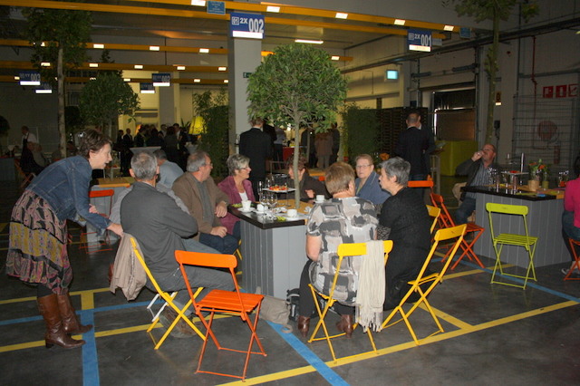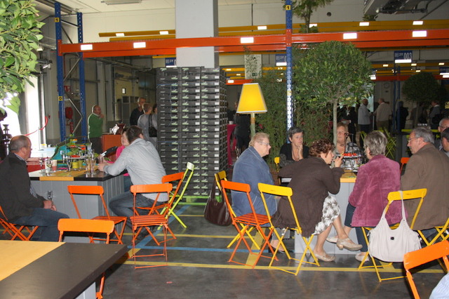 Het distributiecentrum is omgetoverd tot een gezellig 'plein' waar een hapje en drankje genuttigd kan worden.