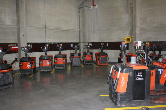 De magazijntrucks worden opgeladen zodat ze maandag weer vol aan de bak kunnen.
