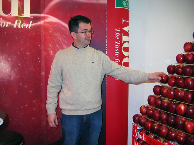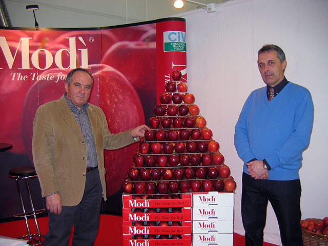 Italian breeders consortium CIV. Michelangelo Leis (Vivai Mazzoni) and Francesco Tagliani (Tagliani Vivai) besides an exposition of Modi apples
