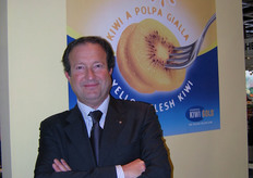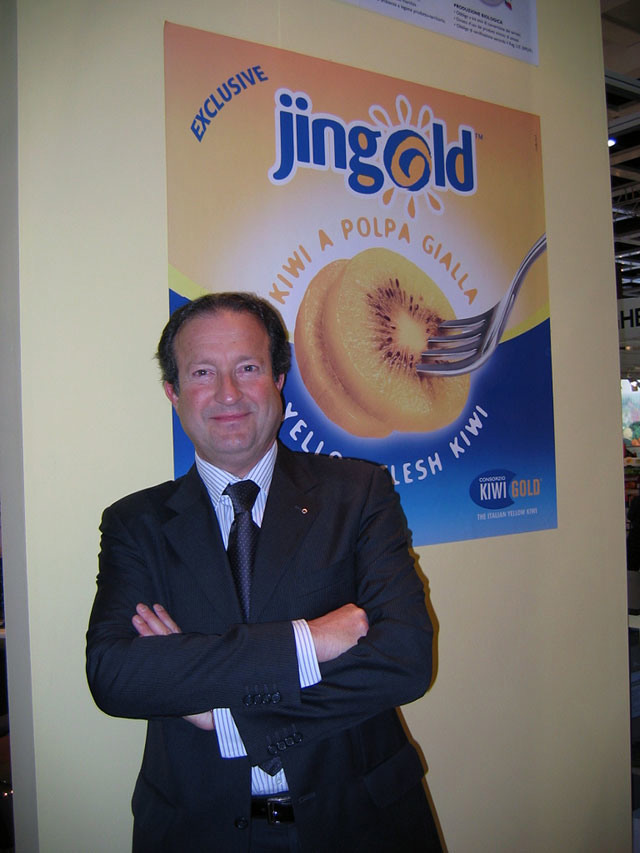 Kiwigold chairman Patrizio Neri presenting the new logo Jingold for the Italian yellow kiwi production. The stand Kiwigold was placed within the Italian exhibition (Piazza Italia) at Fruit Logistica