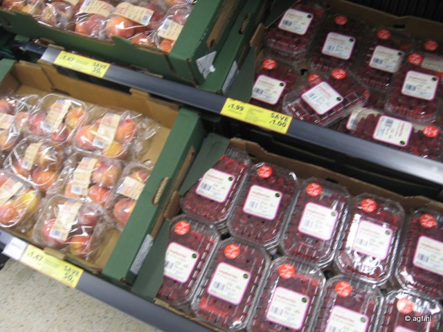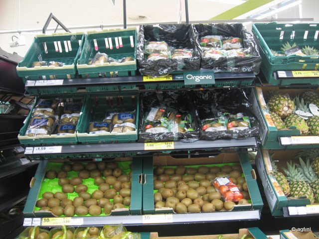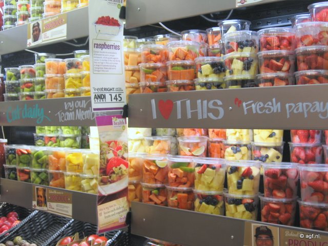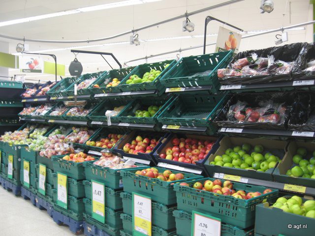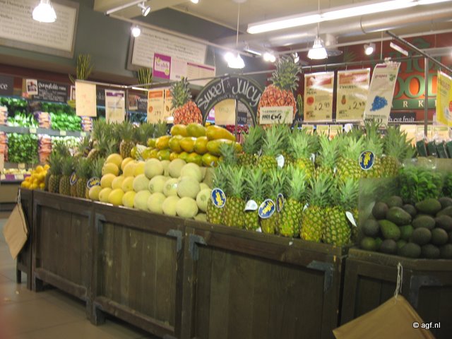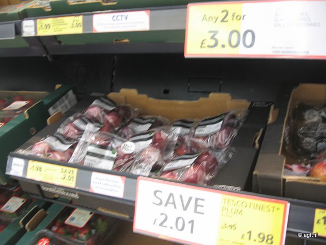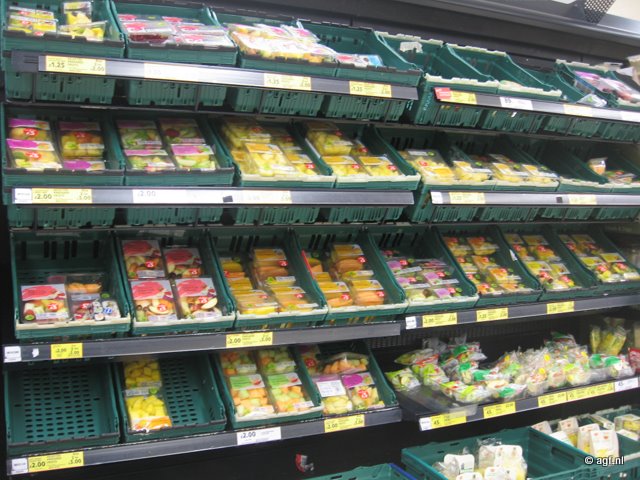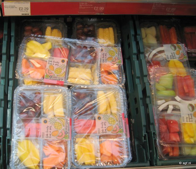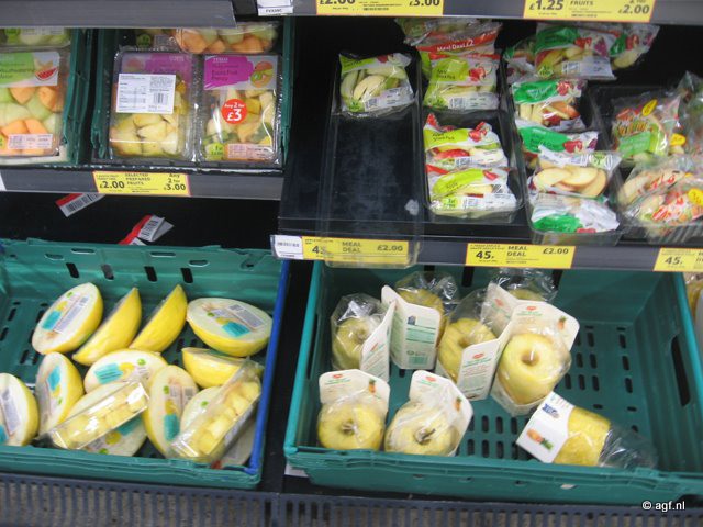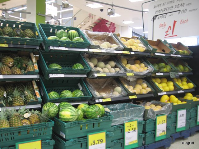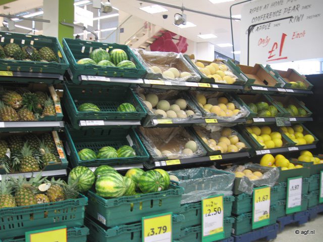 Tesco; linksonder halve meloenen, rechtsonder geschilde ananas en appelpartjes.