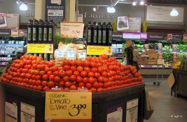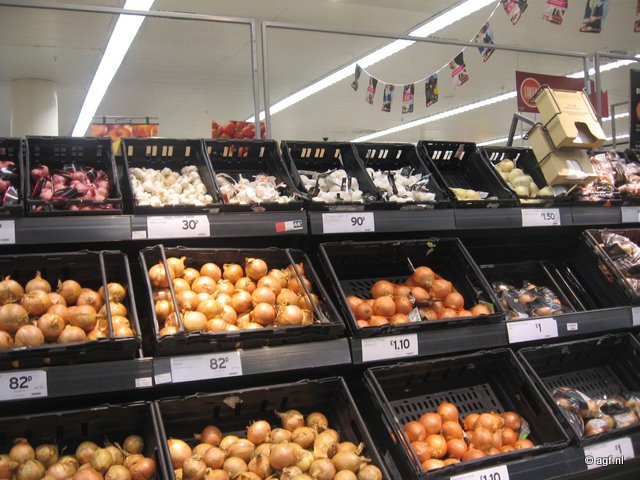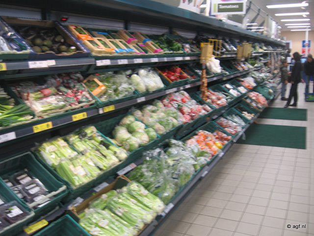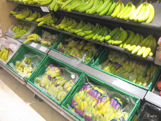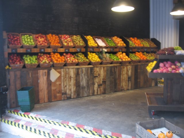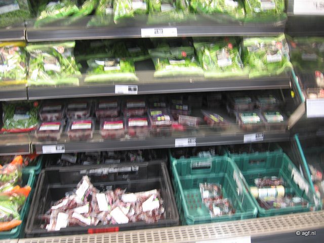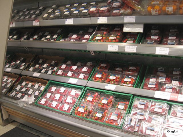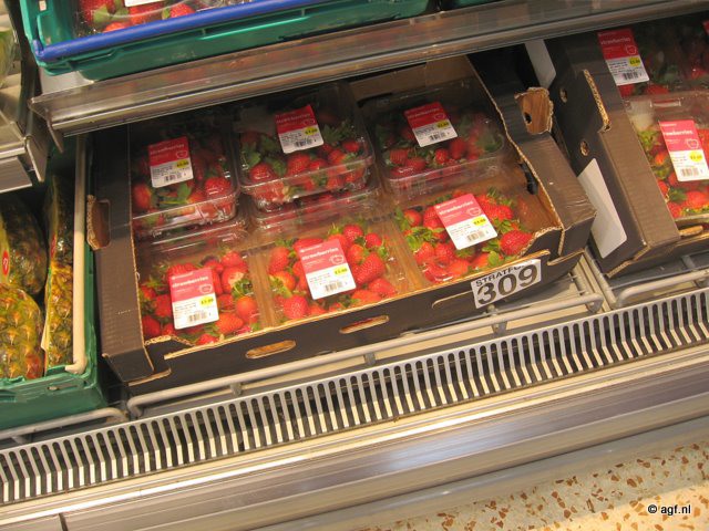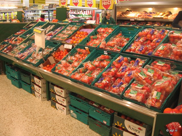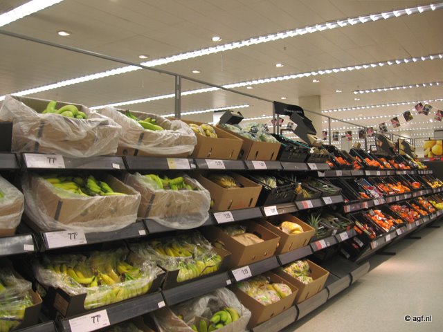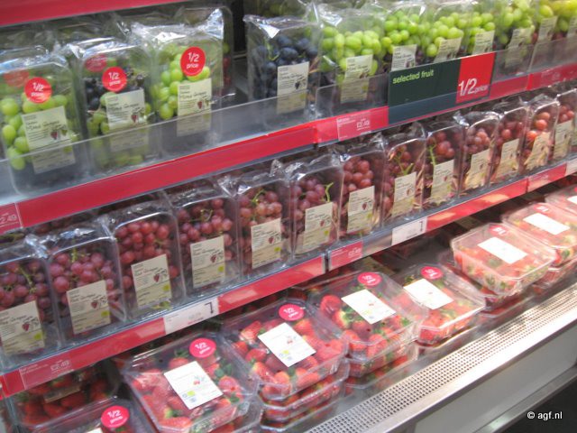 Tesco; linksonder halve meloenen, rechtsonder geschilde ananas en appelpartjes.