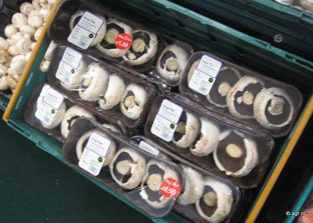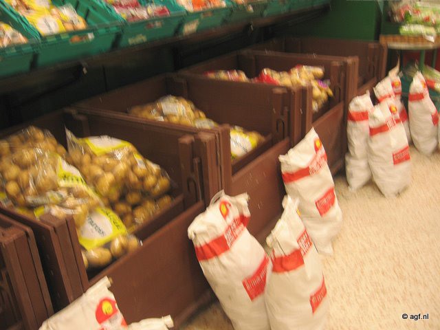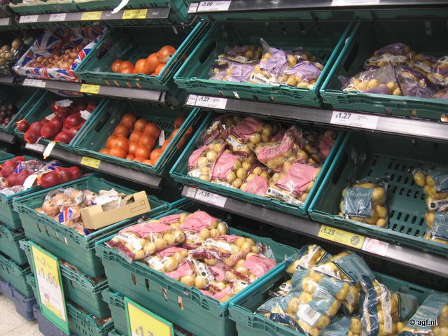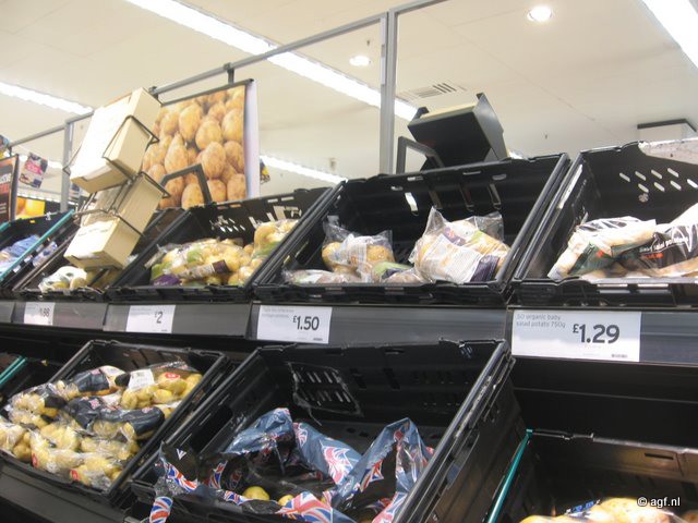 Sainsbury's; lege zak aardappelen met daarop duidelijk de Britse vlag