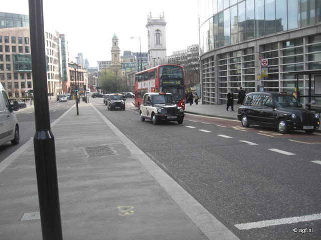 Het straatbeeld in Londen. rechts het kantoor van Sainsbury's