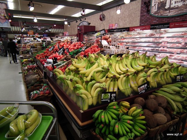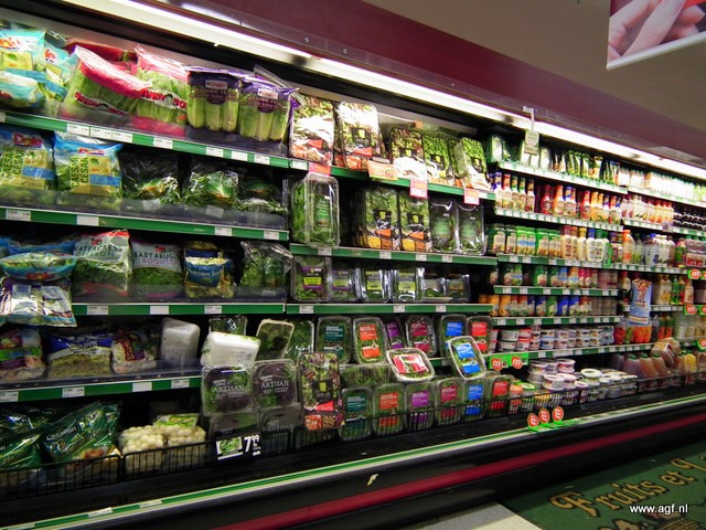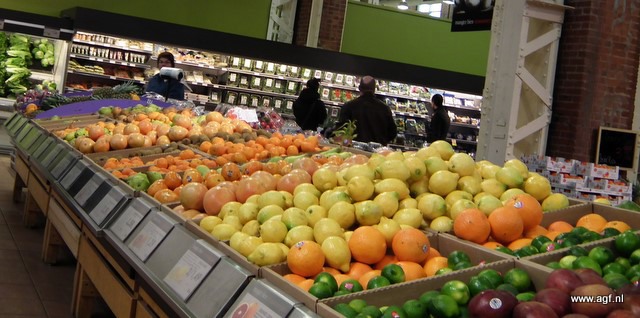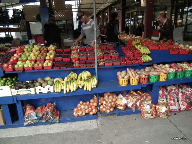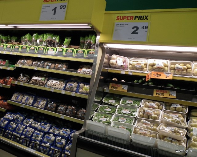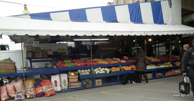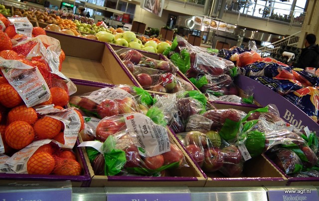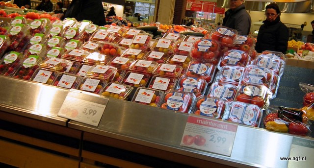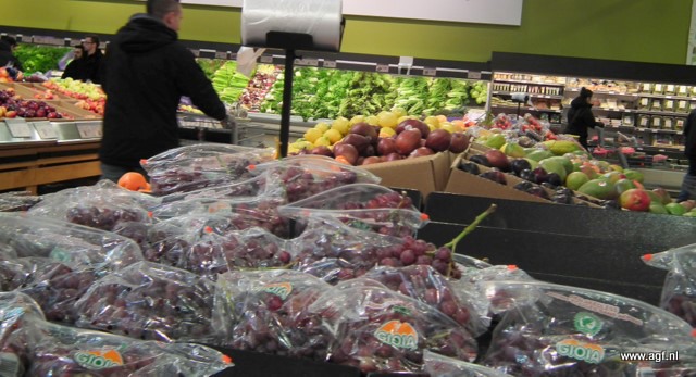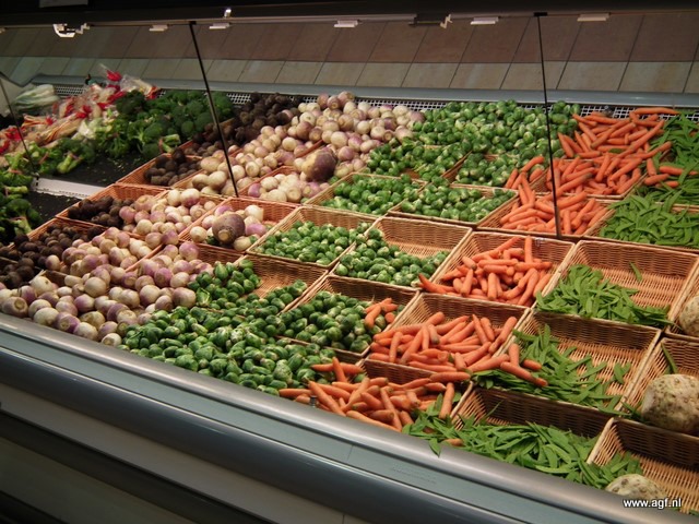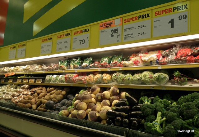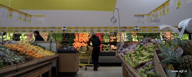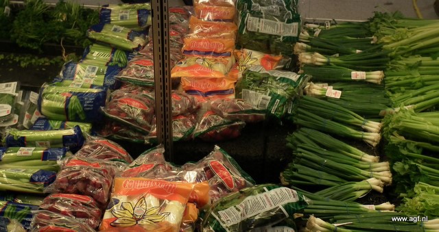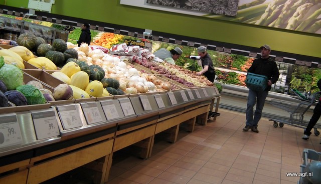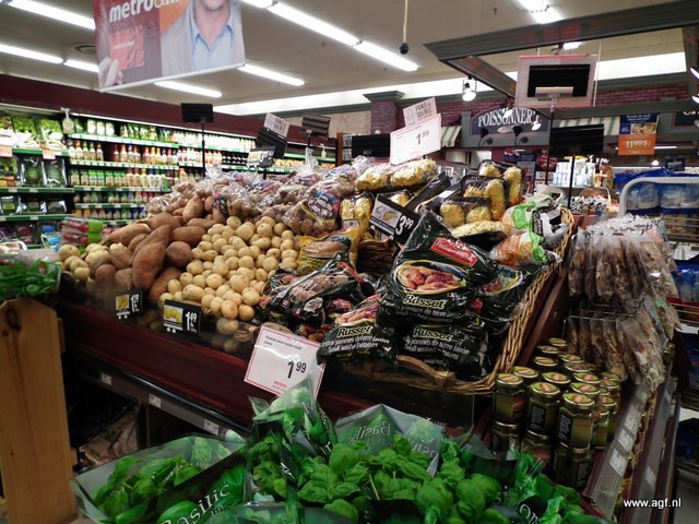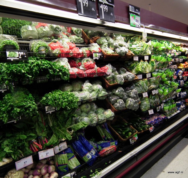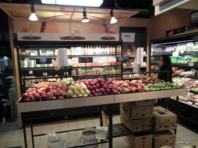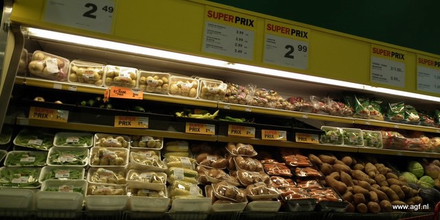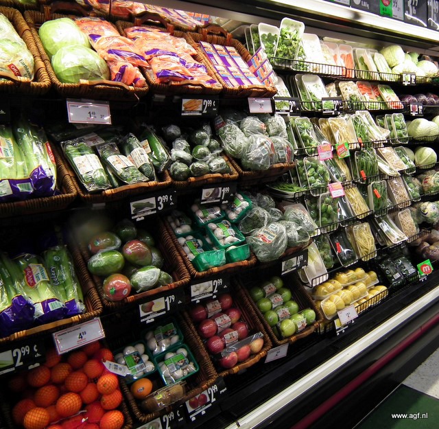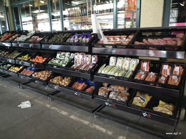 AGF-speciaalzaak met buiten een stalling verpakte agf en