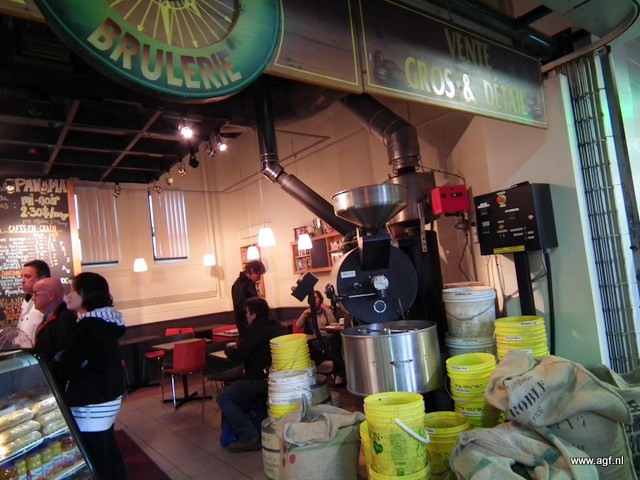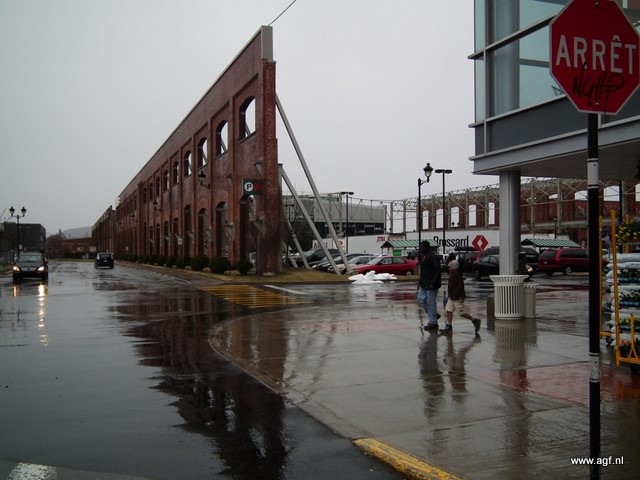 "zicht op het oude fabrieksgebouw. rechts achterin dat gele ding met "a vous" erop is nog een lift die in het pand aanwezig is gebleven."