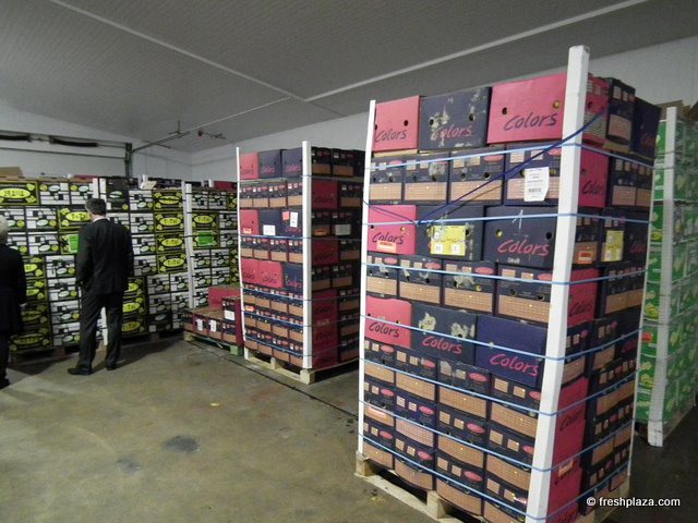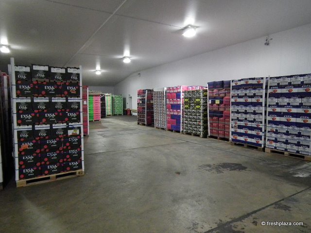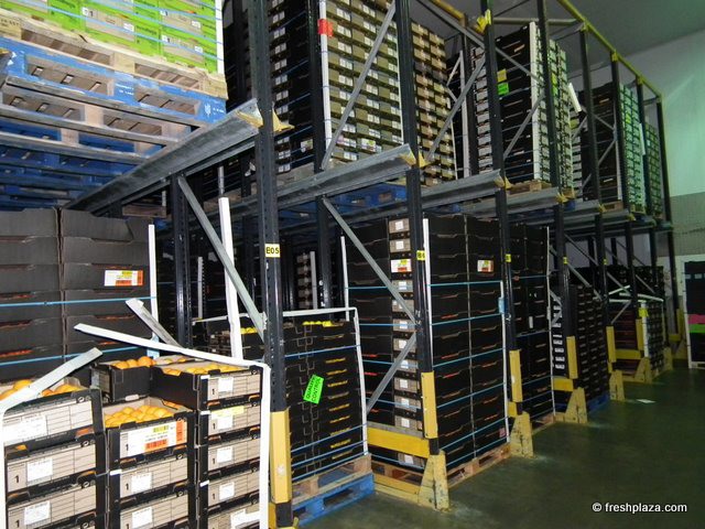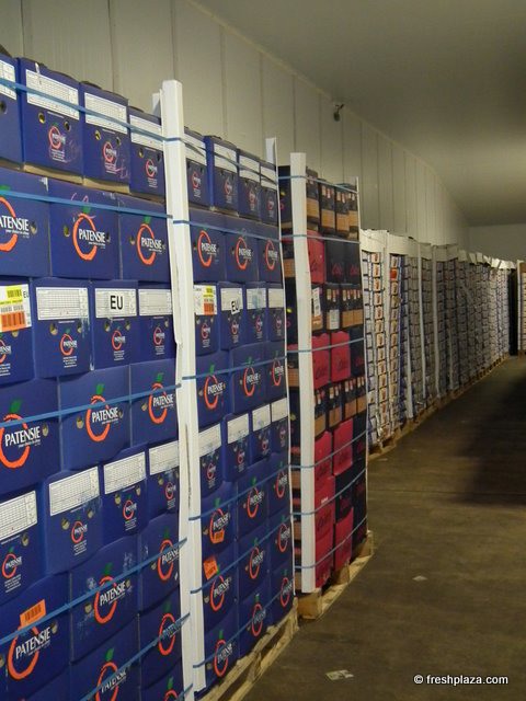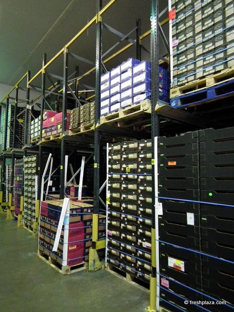 Grote voorraden fruit. Er is bewust niet gekozen stellingen maar 1 laags opslag om snel bij het fruit te kunnen