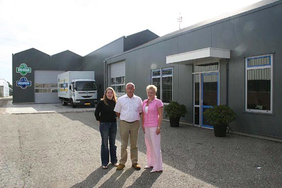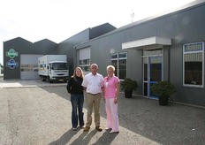 Henk Overkleeft geflankeerd door zijn dochters Danielle en Miranda voor de nieuwe entree van Biostar.