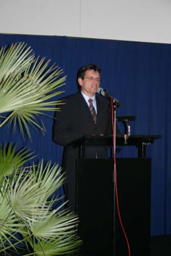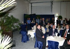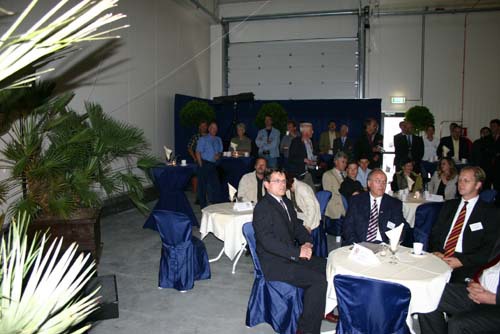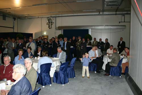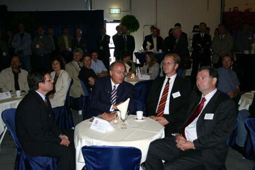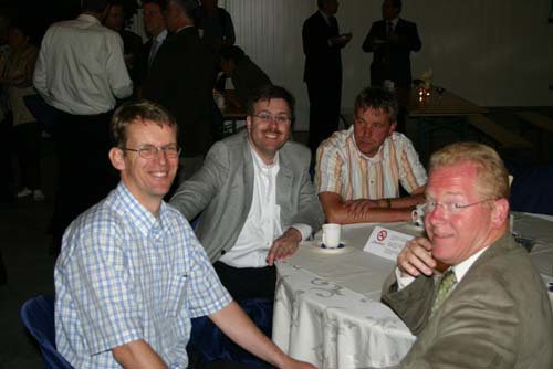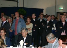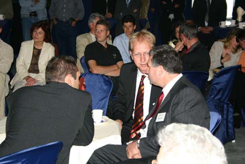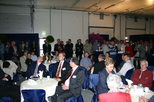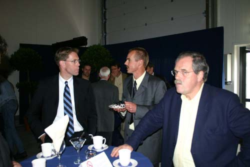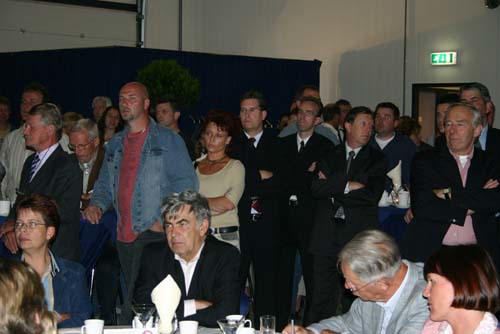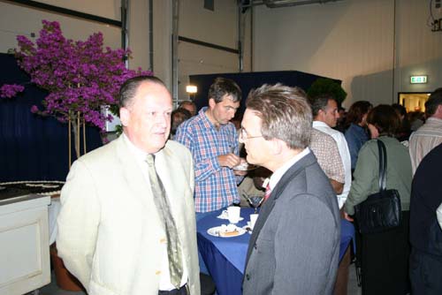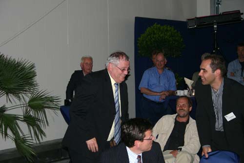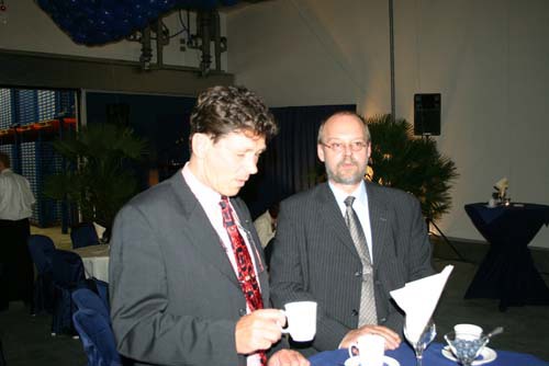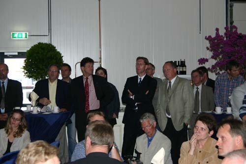 Onderonsje bij de sprekers: spreker gedeputeerde Ger Driessen is nog niet binnen.
