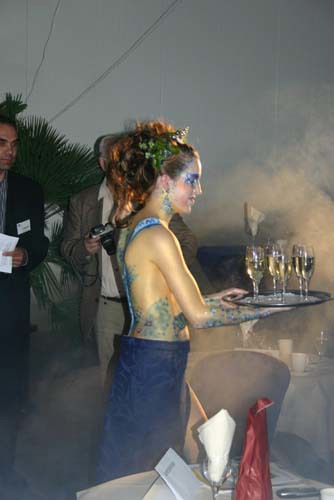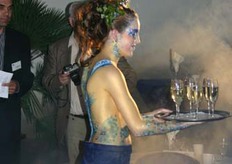 Een bodypainted dame komt uit de rook tevoorschijn.