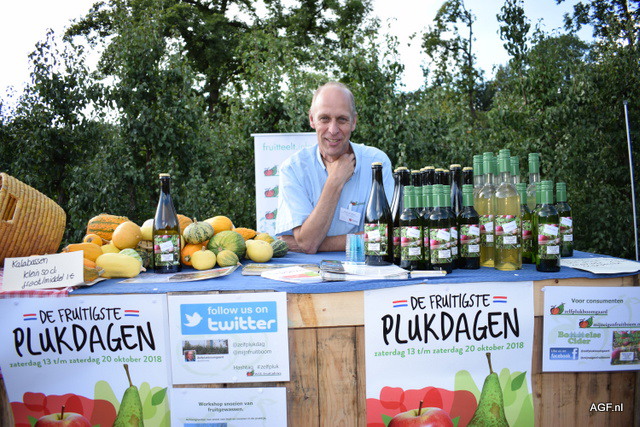 Wouter van Teeffelen met ciders zonder bubbels en promotie voor De Fruitigste Plukdagen bij de Zelfplukboomgaard
