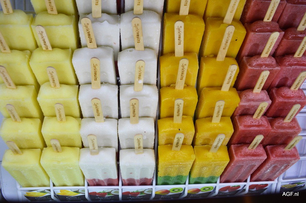 Het concept van Spring Fruits: Fruit op een stokje. In het fruitijs zit zeventig tot negentig procent fruit.
