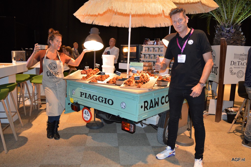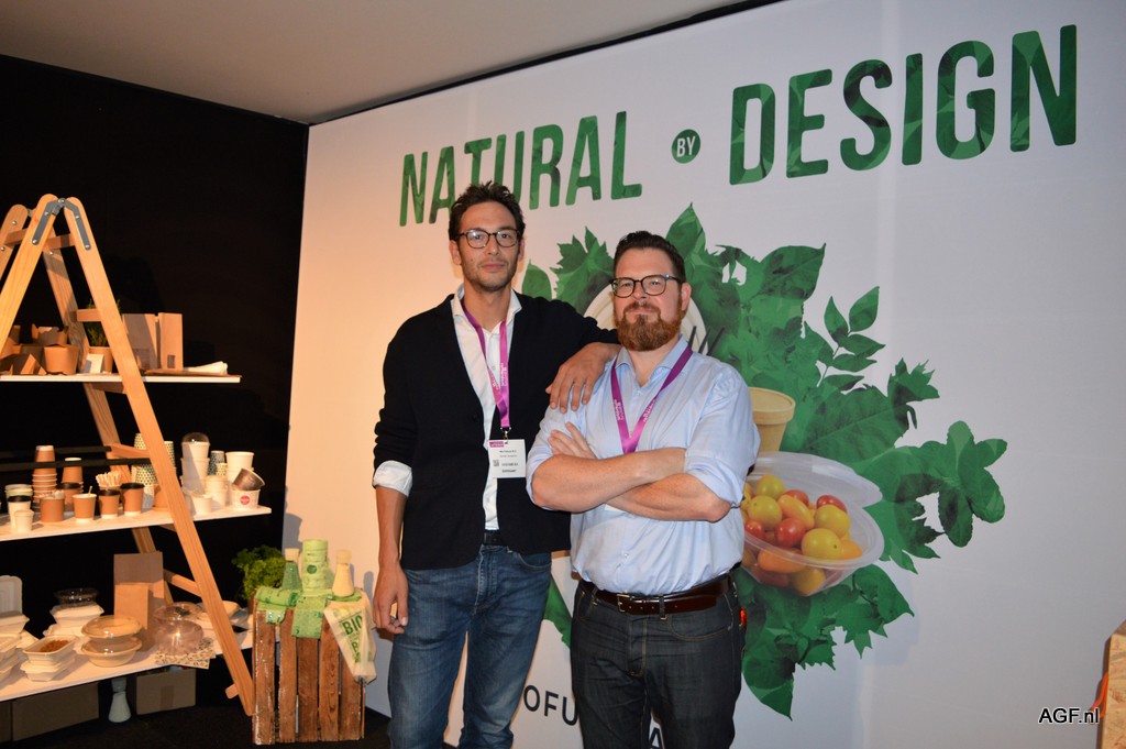 Sander Lenselink en David Gnatzy van Bio Futura. Ook dit jaar weer een groot assortiment duurzame disposables en verpakkingen uitgestald op de beurs.