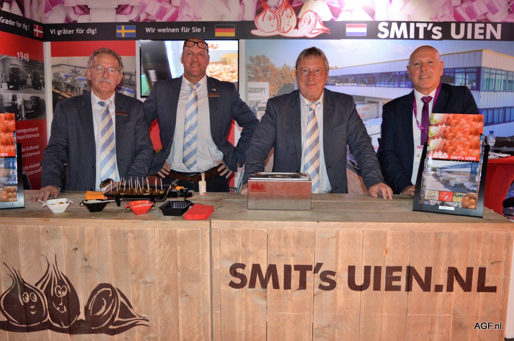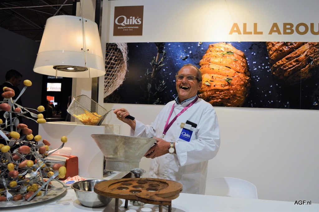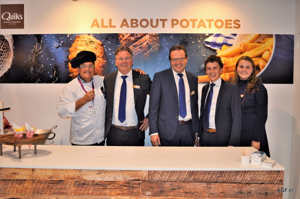 Het team van Quiks met Kees van der Burg, Kees van Veldhoven, Peter Hoogendoorn, Marco van Helden en Henja van Wijk. Zij poseerden met gebakken krieltjes voor de vis- en aardappeltak binnen de foodservice. Ook dozen grillaardappelen in diverse gewichtsorteringen waren te zien voor publiek.