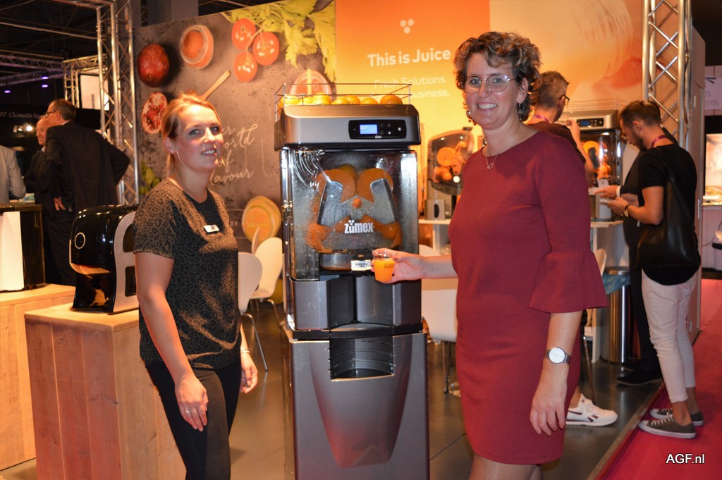 Lynn Dobbelstijn en Danielle Rorije van Zumex. Zij leveren sinaasappelpersen in diverse soorten en maten.