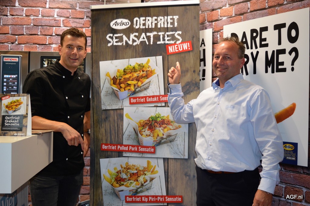 Trotse kok Rob Kollen en Dirk-Jan van der Meijn van Aviko bij het nieuwe concept Oerfriet Sensaties.