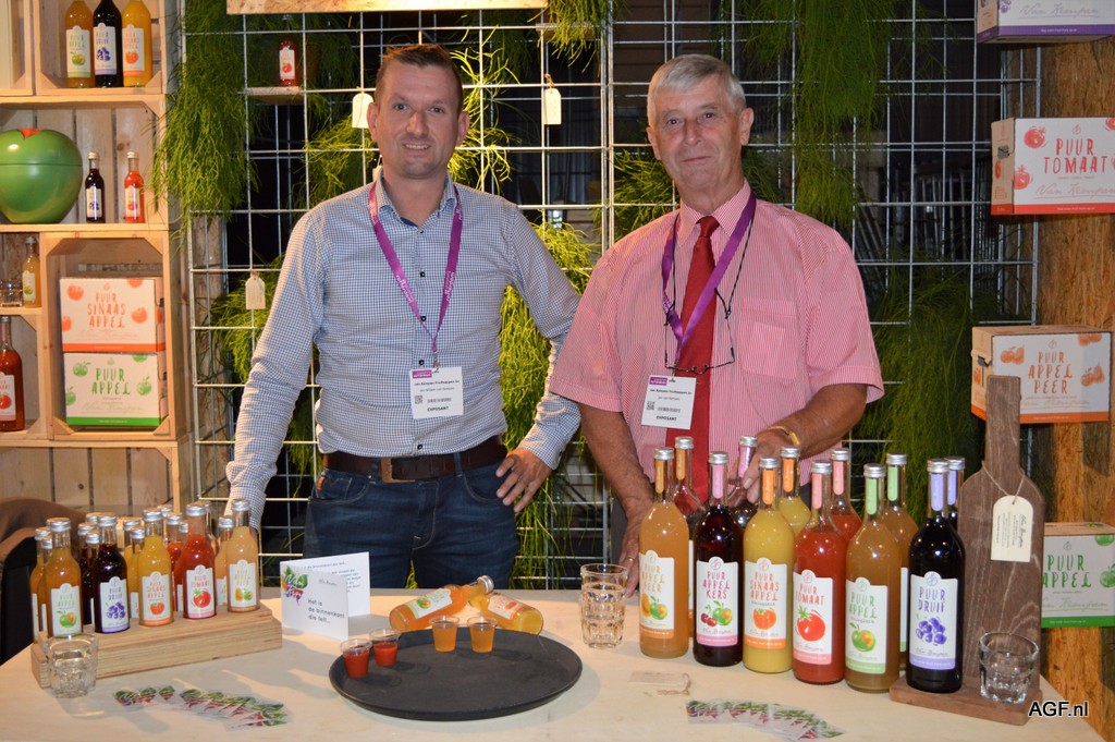 Jan-Willem en Jan van Kempen bij het assortiment fruitsappen. Nieuw in het assortiment is de puur tomtaat grote fles.
