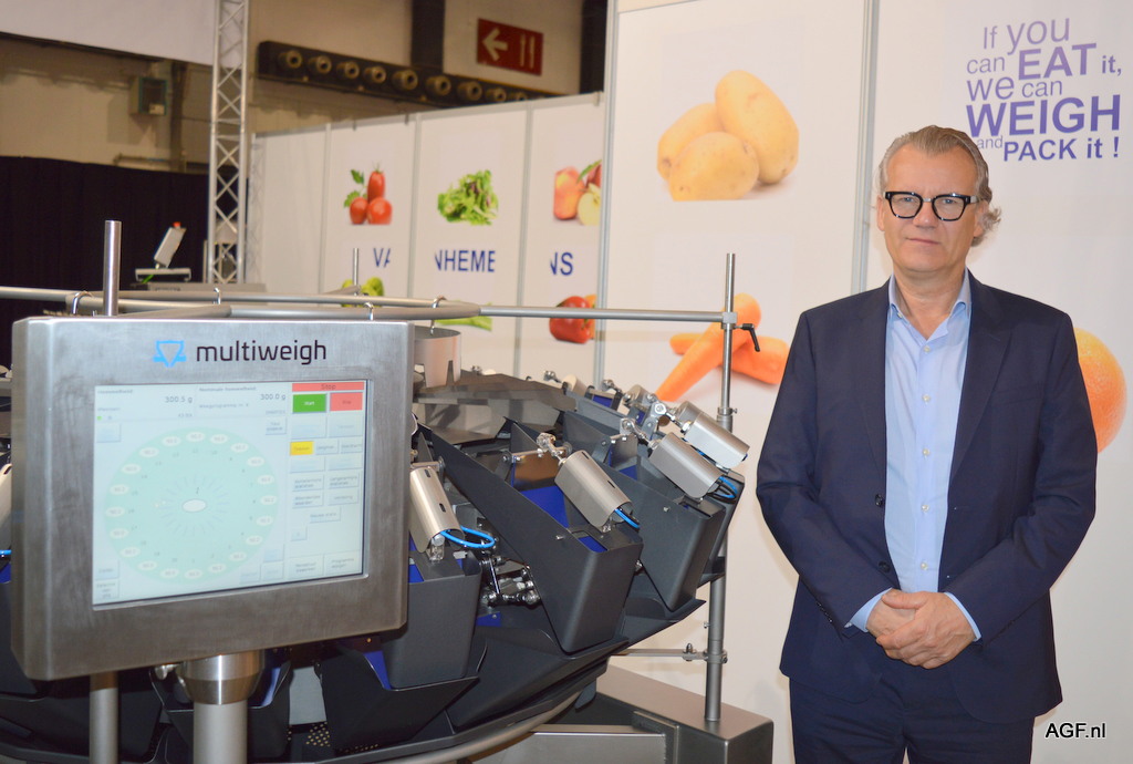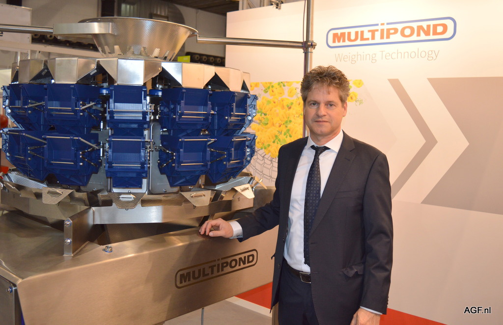 Frank Caris van Multipond poseert bij een multiheadweger die is uitgerust met het geavanceerde 'Argus' systeem. Dit systeem reguleert de productstroom bovenop de weger. Ook moeilijkere producten zoals rucola, spinazie, veldsla en taugé worden met dit systeem perfect gewogen. De Argus is uitgerust met 3D camera's en is gepatenteerd.