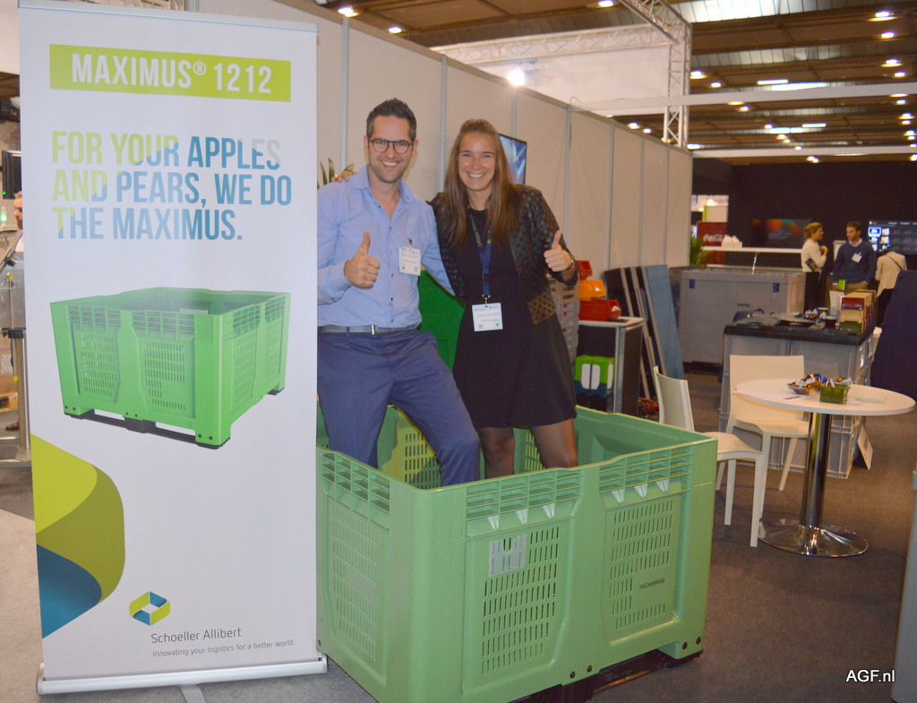 Schoeller Allibert. Piet De Lausnay en Silke de Cock zijn enthousiast over de Maximus 1212. De grootste bigbox in zijn soort voor het bewaren van appelen en peren. De bakken worden in België geproduceerd.