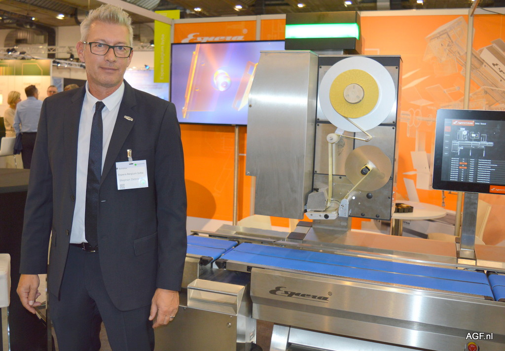 Stephan Debrandt van Espera Belgium weeg- en etiketteer machines poserend bij een etiketteermachine die voorzien is van een camera voor onregelmatige producten. De camera geeft de informatie door aan de PC en de machine plakt het etiket op de meest geschikte plek.